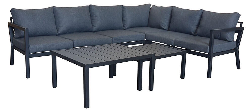 Gruppen leveres med sort ramme på hjørnesofa (to sofaer) og to bord, rygg-og seteputer og et sett med impregnerte putetrekk i fargen mørk grå.