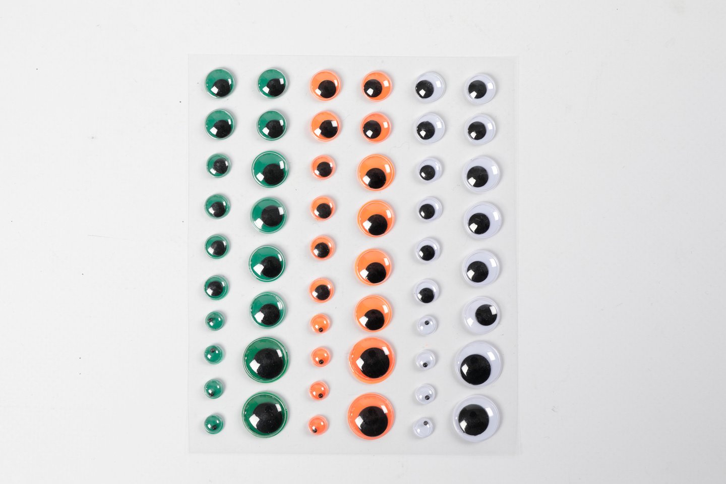 Rulleøyne med bevegelige pupiller og flat bakside uten lim. Pakke à 54 øyne, i 6, 8, 10, 12 og 15 mm i diameter