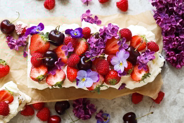 - Fordel kremen på toppen av iskaken og pynt med masse friske bær, gjerne med spiselige blomster også.