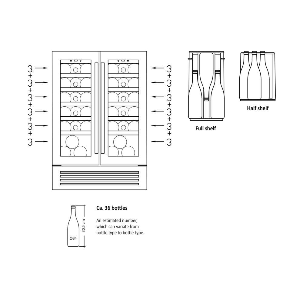 SV 91 X kan brukes som et innebygd eller frittstående vinskap. Skapet har to soner som kan stilles inn mellom 5°C - 18°C uavhengig av hverandre. Skapet har plass til 36 standard flasker fordelt på 12 hyller i bøk med stålfront, inkludert 10 uttrekkbare hyller og 2 stasjonære. Et vakkert skap for oppbevaring av flaskene dine.