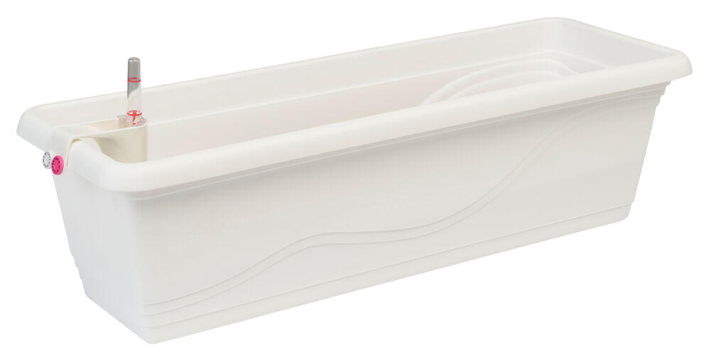 En solid balkongkasse i plast som primært er til utendørs bruk. Det medfølgende selvvanningssystemet gjør at vannet magasineres opp under planteflaten slik at planten kan hente vann fra magasinet og man slipper å vanne så ofte. Vannmengdeindikator følger med.