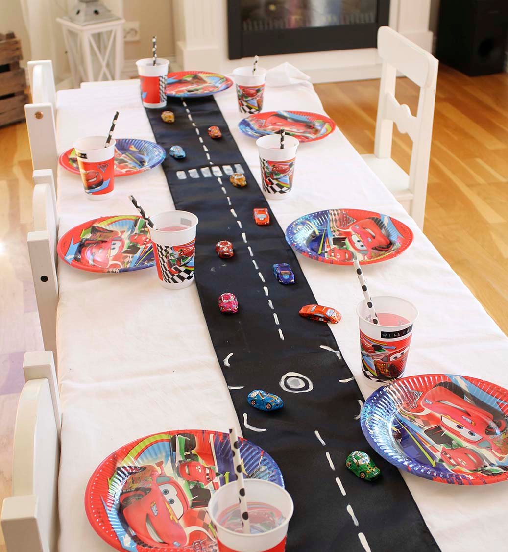 ENKELT TRIKS: Et avlangt stykke svart tøy med bilmønster malt på. Lekebiler fins kanskje i huset fra før – da har du et supert bursdagsbord for små bilentusiaster.