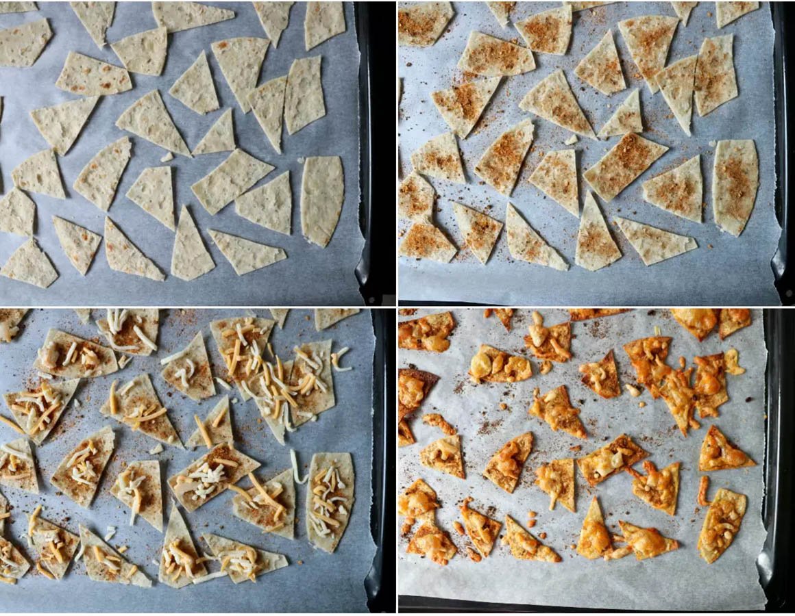 1. Skjær eller klipp lompene opp i biter, legg på et stekebrett med bakepapir og strø over valgfritt krydder. Ha over litt ost om du ønsker, her er det brukt en osteblanding av mozzarella og cheddar som ble veldig godt.