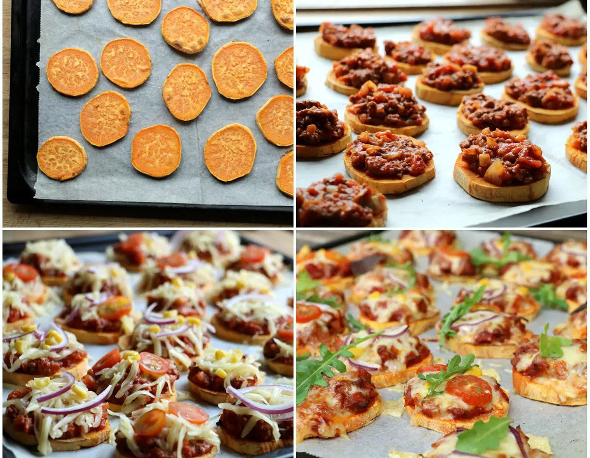 1. Start med søtpotetene, siden de skal forstekes. Sett ovnen på 180 ˚C. Skrell søtpotetene og del i ca. 1 cm tykke skiver. Fordel over langpanner med bakepapir og forstek i ca. 15-20 minutter, eller til søtpotetskivene begynner å bli møre (husk varmluft om du har to brett i ovnen).