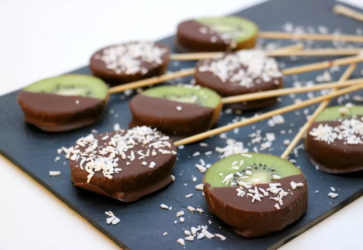 Trenger du egentlig godteri når du kan servere vakre kiwipinner, dyppet i sjokolade? Du kan fint ta vekk skallet, men går også helt bra å spise det. Server dem kalde med stivnet sjokoladetrekk, eller helt fryste som ispinner.