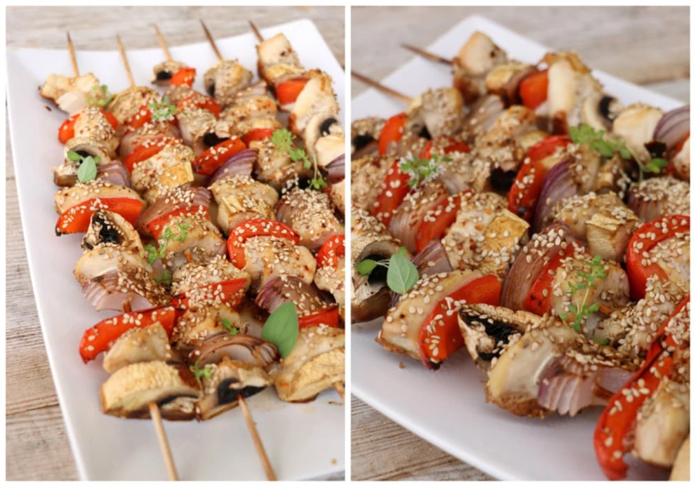 1. Del kylling og grønnsaker i passelige biter og tre på 6 spyd. Ha over grovkvernet chili, hvitløk, en slump soyasaus og strø over sesamfrø til slutt.