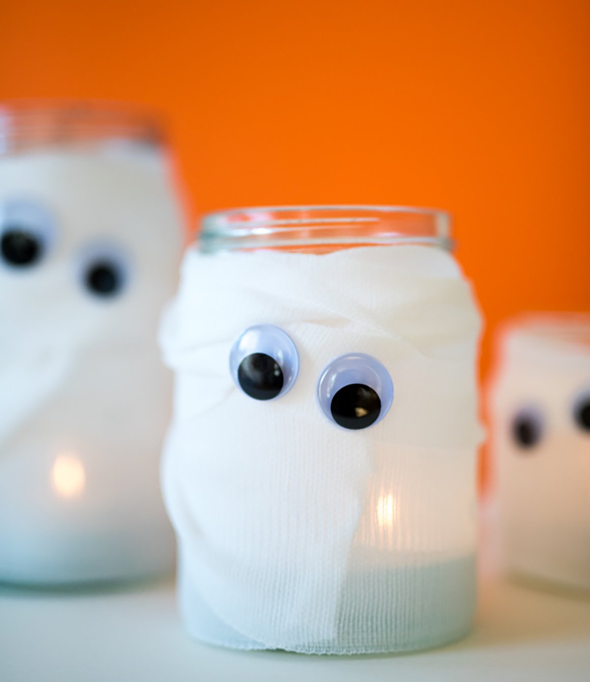 Disse stemningsfulle mumie-lyktene lager du enkelt av tomme syltetøyglass. Bruk gjerne glass i ulike størrelser.