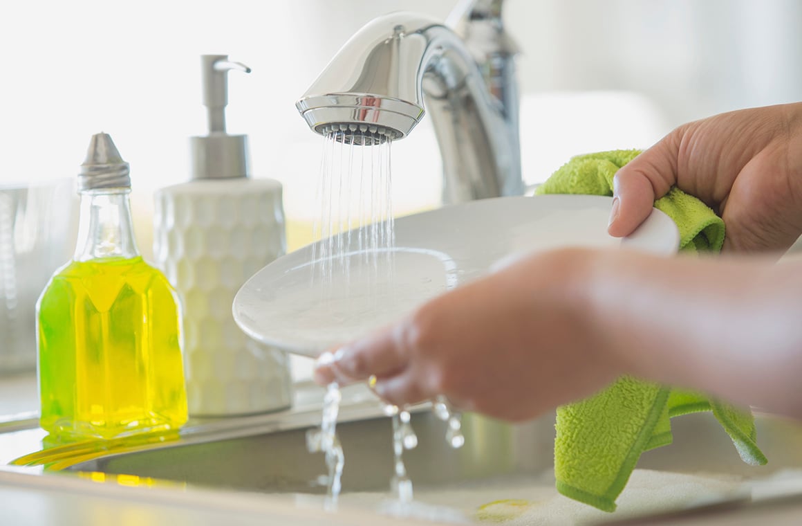 SKYLL MED MÅTE: Tallerkener med mye middagsrester bør skylles, men overdreven skylling er unødvendig.