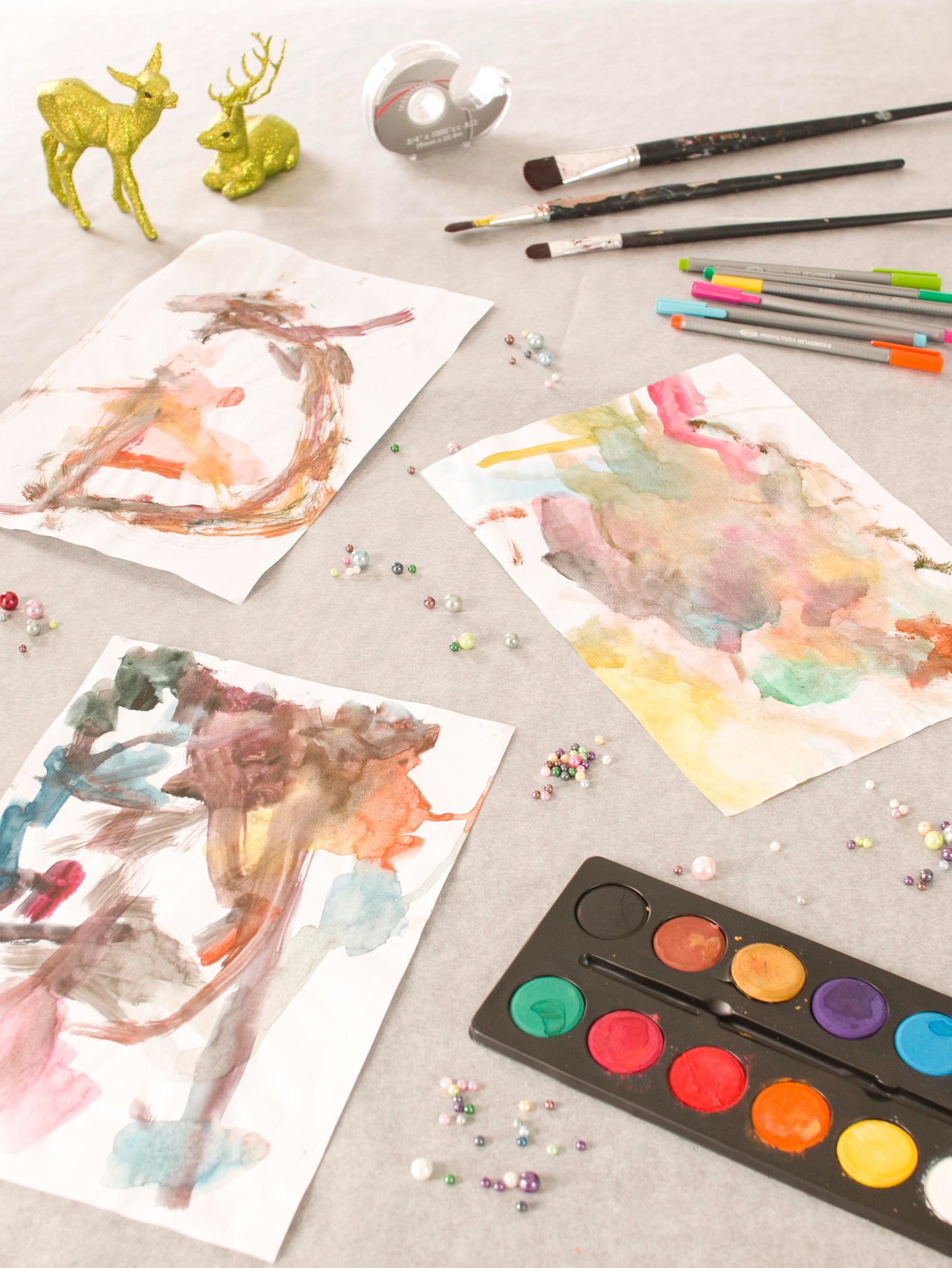 Slik gjør dere det: La barna male sitt eget gavepapir, det er både enkelt og dekorativt! Velg ut et fargetema, for eksempel rødt og grønt, eller la barna velge selv.