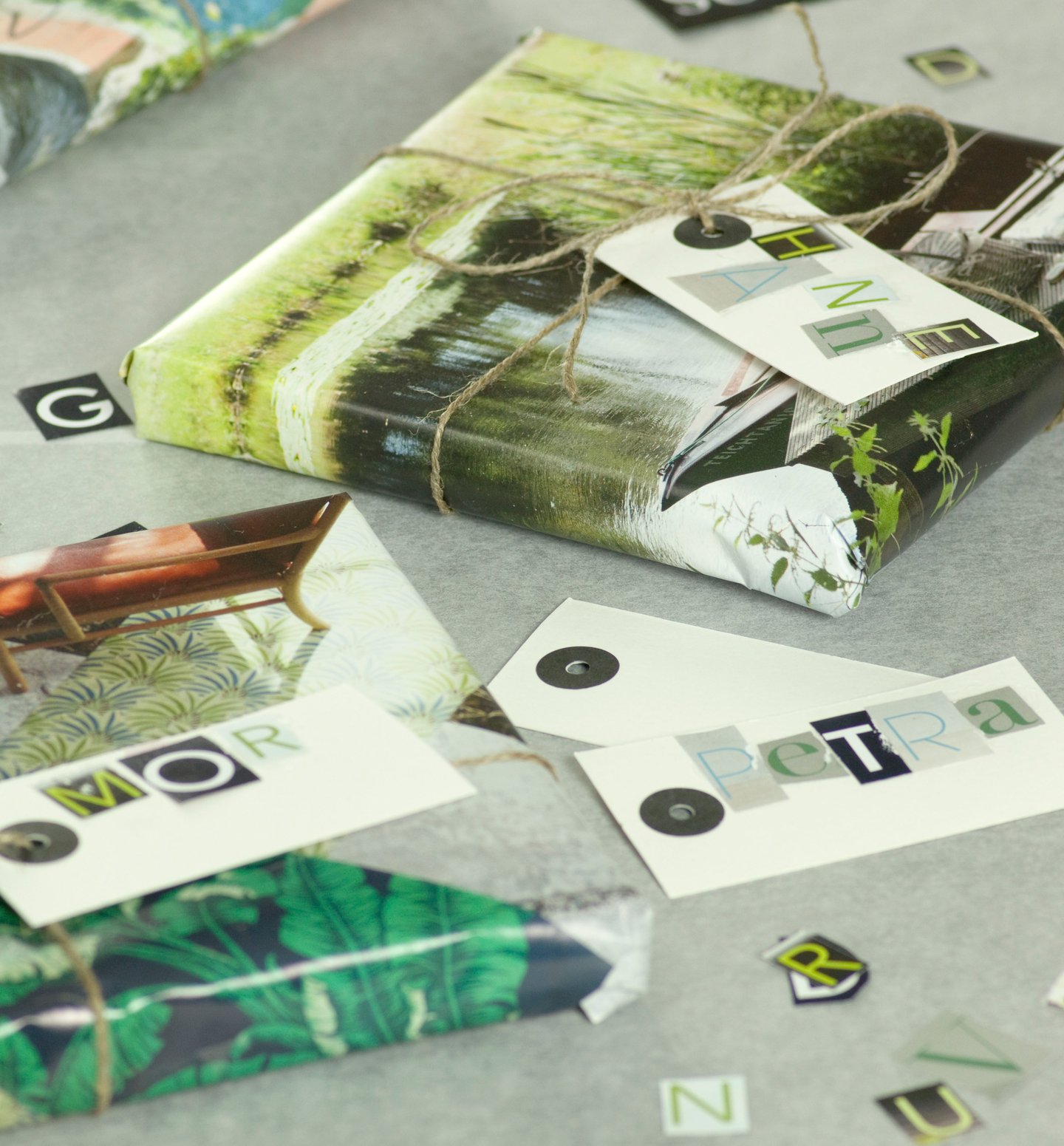 Slik gjør dere det: Finn fram ukeblader eller fine magasiner og la barna rive ut eller klippe ut hele sider som brukes som gavepapir.
