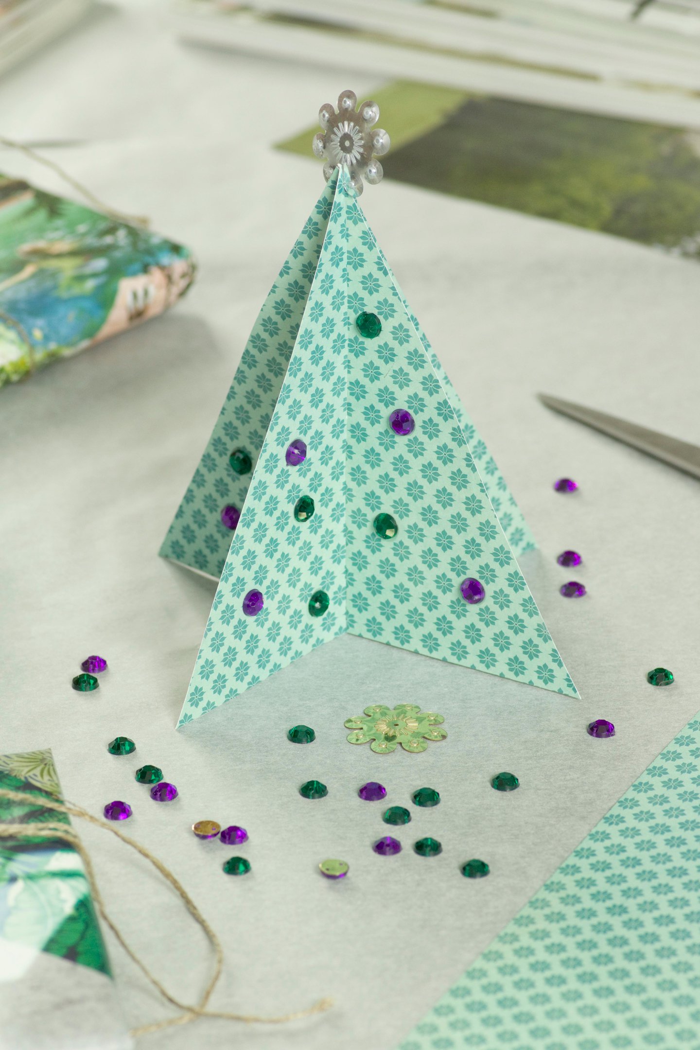 Tegn og klipp ut to trekanter, klipp hakk fra spissen og ned mot midten i den ene trekanten, og hakk fra bunnen og opp mot midten i den andre trekanten. Lim på paljetter, perler og annen pynt før treet settes sammen. Da er det bare å træ dem i hverandre slik at de blir til et tre.