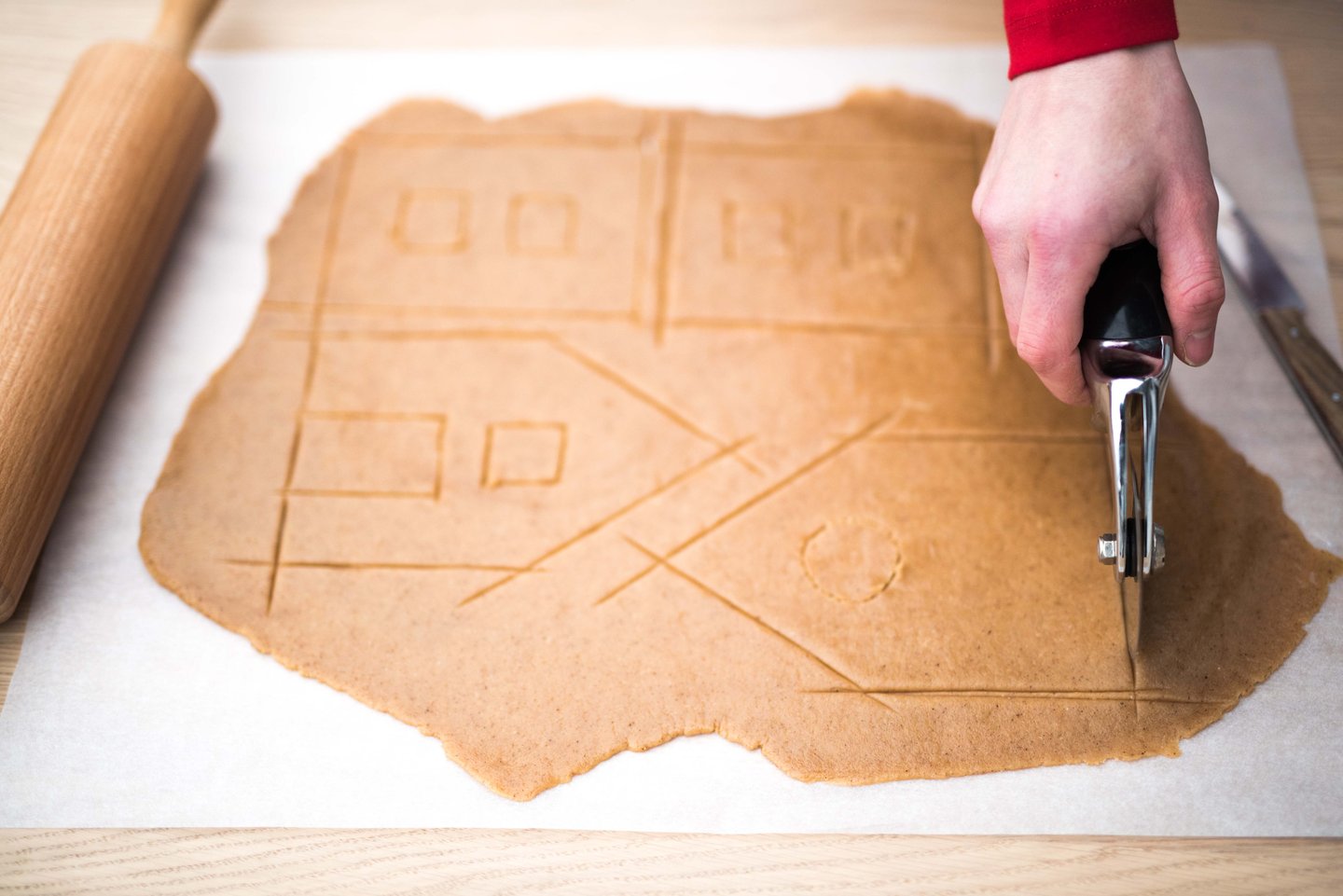 Kjevle deigen direkte på bakepapiret før du skjærer ut delene. Kjevle deigen til den er ca 3-4 mm tykk. Legg på formene på deigen og skjær rundt dem. Bruk gjerne en pizzaskjærer og/eller en liten kniv. Fjern den overflødige deigen.