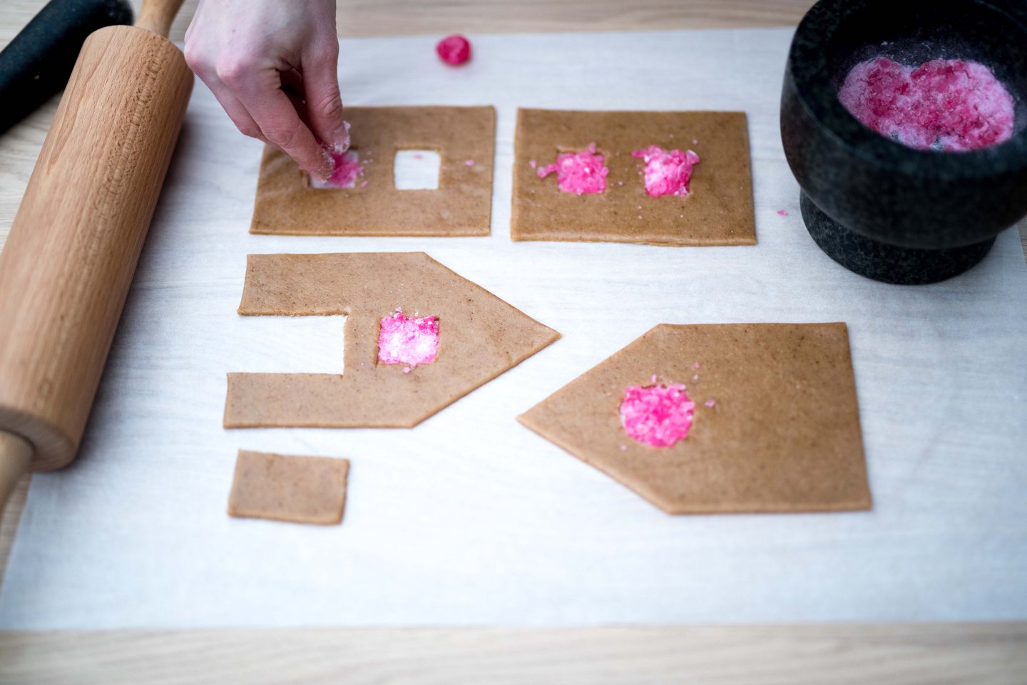 Før steking - legg knuste drops i ”vinduene”. Dekorativt og stemningsfullt.