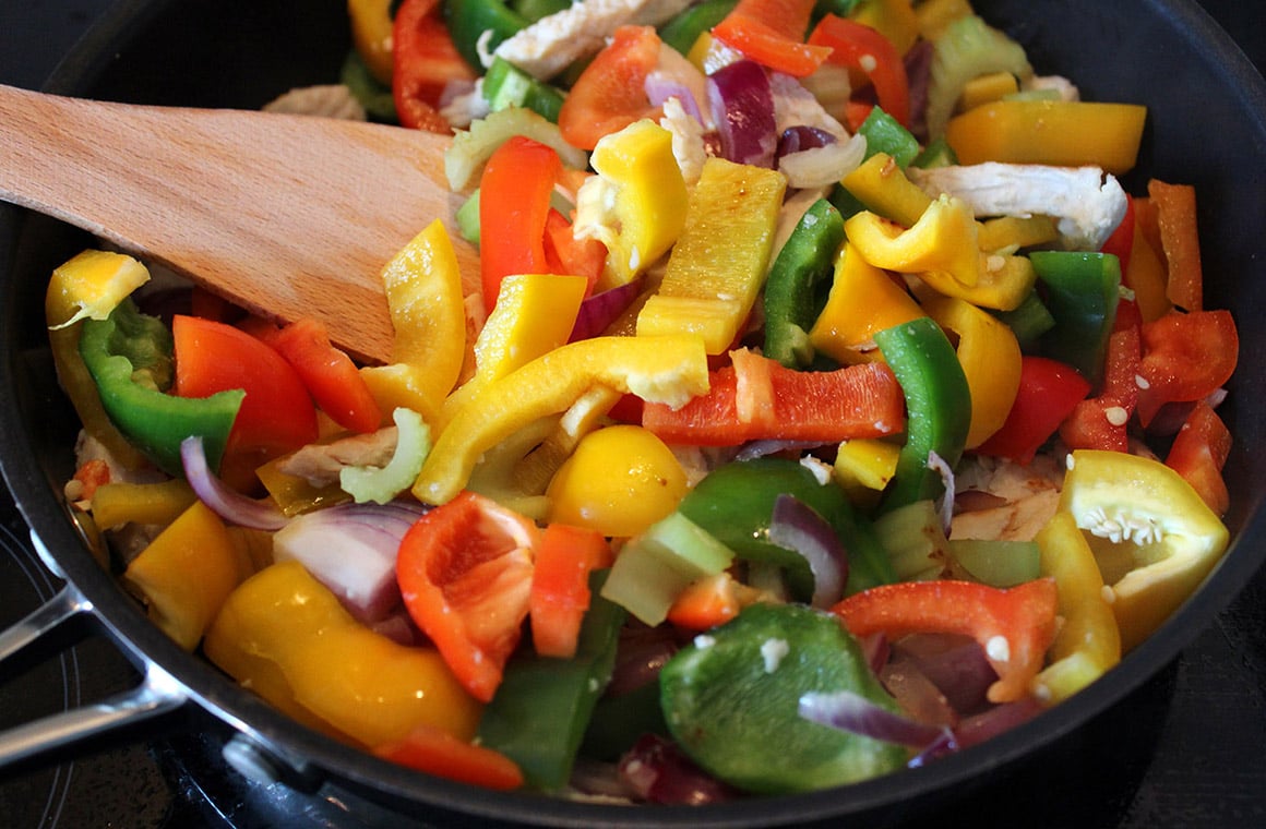 FRESENDE FARGERIKT: Stek kylling og grønnsaker hver for seg, før du blander alt sammen.