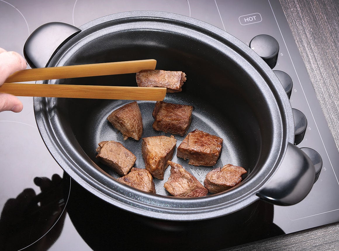KAN STEKES FØRST: Med modellen fra Russel Hobbs som du får kjøpt på Obs, kan du forsteke kjøttet i gryta først, så sette den i langtidskokeren etterpå.