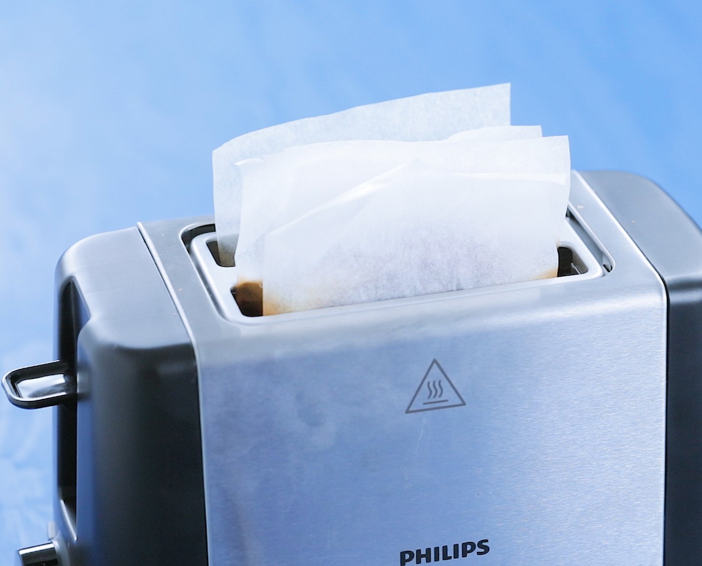 OBS! Pass på at du ikke lar bakepapiret være i brødristeren for lenge. Det tåler kun noen par minutter i den sterke varmen fra brødristeren.
