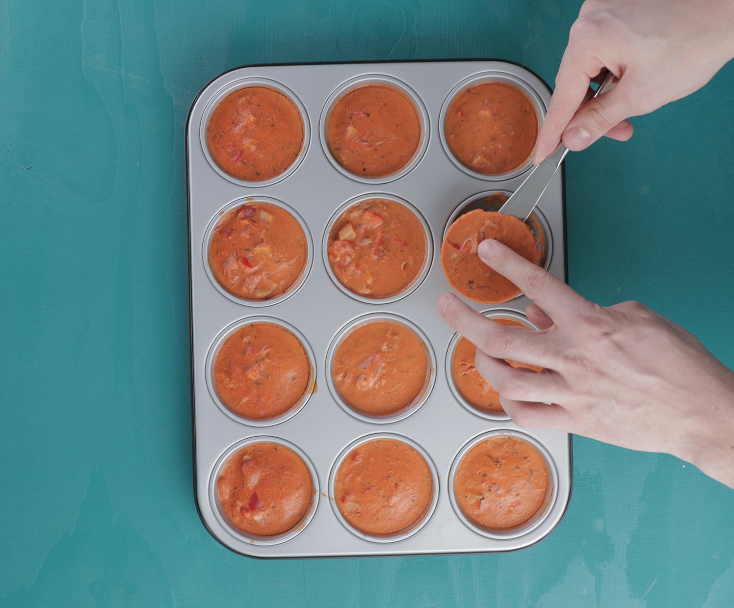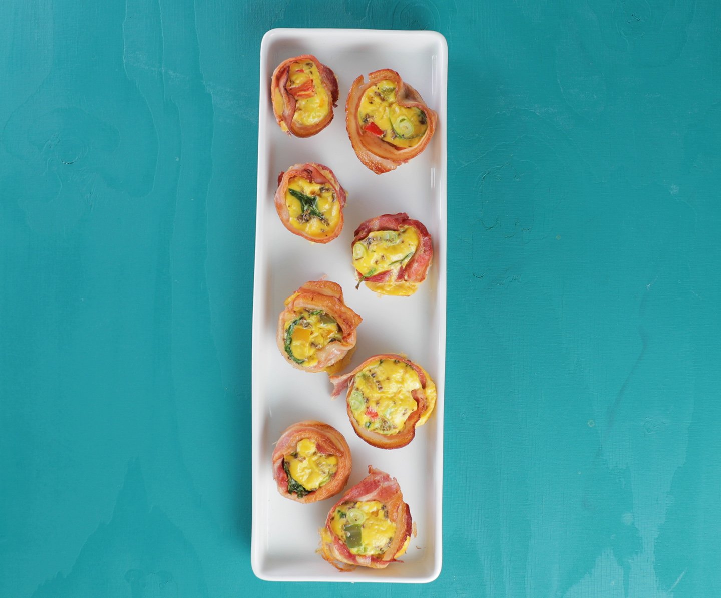 Egg og bacon lager du nemlig i en fei i muffinsbrettet. Dekk hver lille form med en baconskive, slik at du har plass til å kakke egg eller helle omelettrøre oppi. Du kan nemlig velge hva slags eggerett du vil lage i muffinsbrettet, men vi synes det smaker aller best med en deilig omelettrøre.