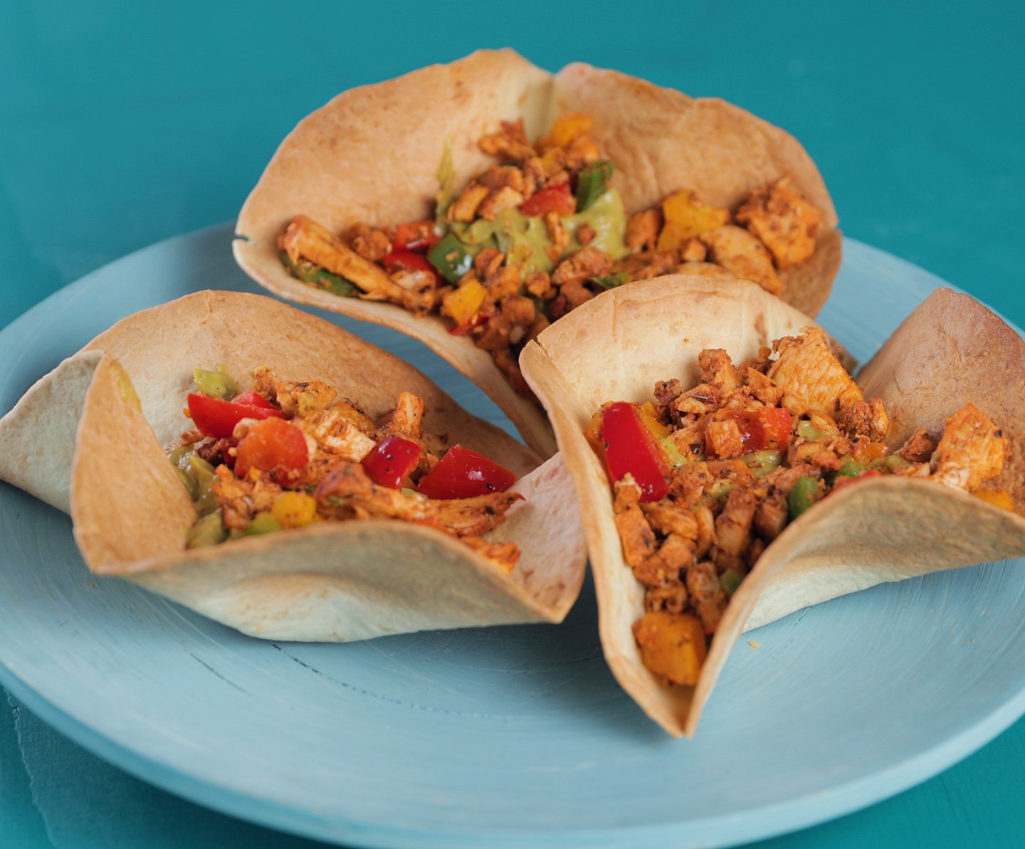 Når du har tatt dem ut av ovnen, er det til slutt bare å toppe med det fyllet du måtte ønske. Vi toppet med hjemmelaget guacamole og stekt kylling. Dette er like godt som det ser fint ut!