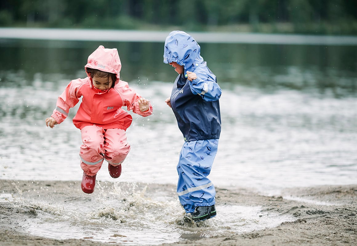 HURRA, DET REGNER!: Regntøyet til barna får gjerne litt hard medfart, derfor er det ekstra viktig å ta godt vare på det. FOTO: Helly Hansen
