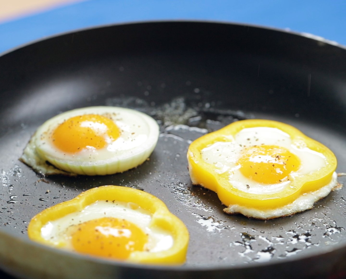 Stekte speilegg er en skikkelig helgefrokost som du enkelt kan gjøre noe morsomt ut av. Steker du eggene i paprika- og løkformer får du både smakfulle speilegg og applaus ved frokostbordet.