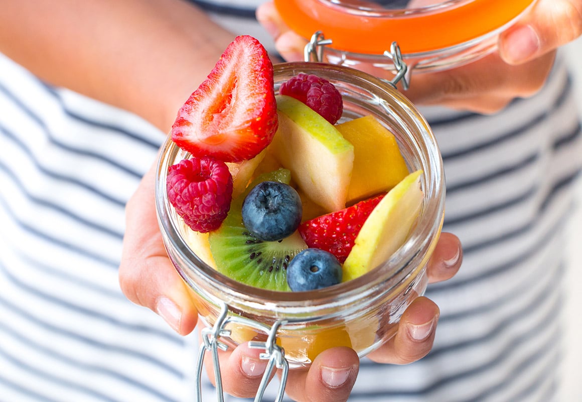 Hvem har sagt at fruktsalat bare skal spises som dessert? Lag en minisalat med frukt som barnet liker godt: kiwi, fersken, druer, mango, pærer – og hvis du sender med noen skjeer dressing i form av yoghurt eller kesam i en egen liten boks, kan barnet kose seg med sunn dessert til lunsj.