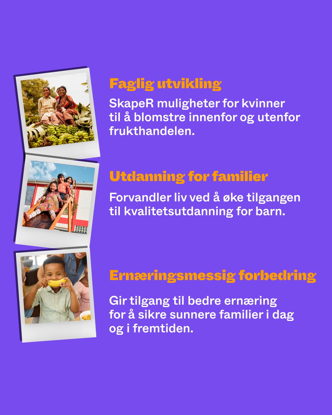 Våre bananer bidrar til å styrke kvinner, gi tilgang til utdanning og forbedre ernæring.
