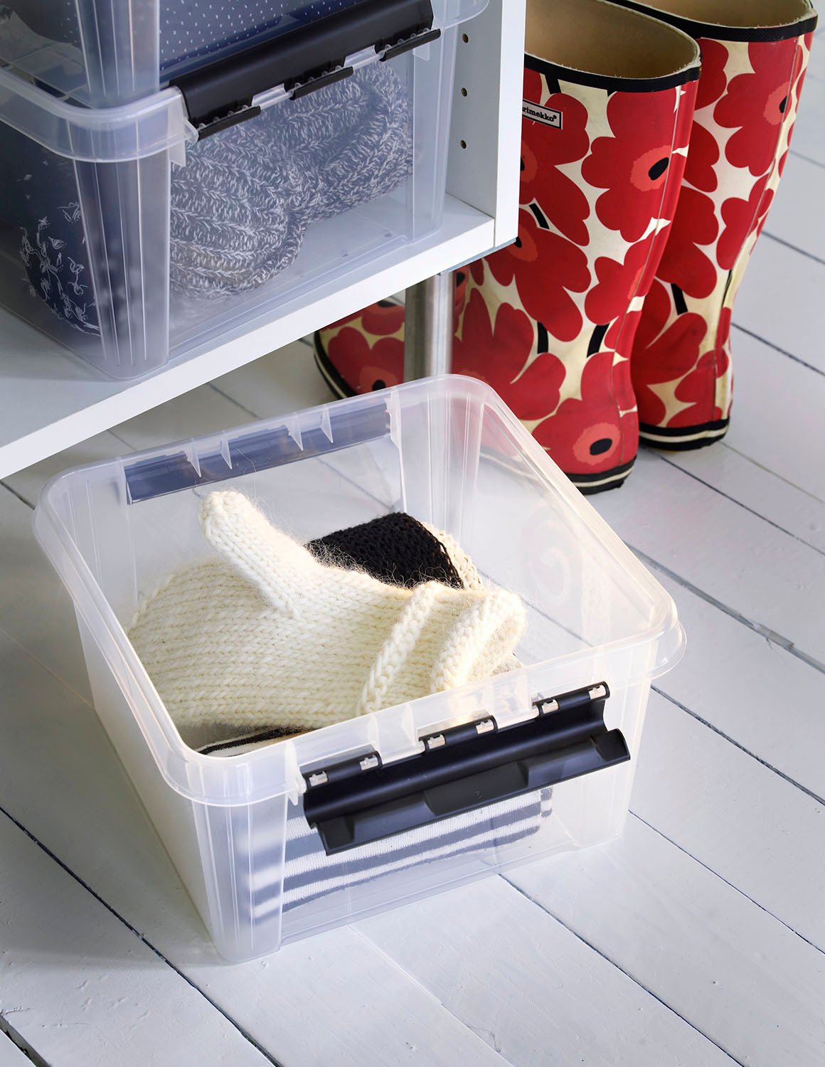 EN BOKS FOR ALT: Egne bokser for votter og skjef og andre småting sparer tid, slik at dere slipper å lete. Bare husk å legg dem der de skal være!