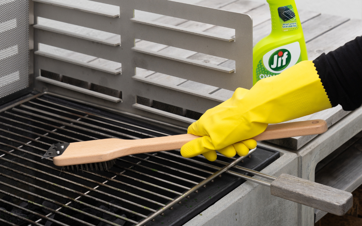 En god grillmiddag starter med en ren grill! Selv om sot og innbrent fett ikke nødvendigvis er skadelig, kan det gi maten en uønsket smak og gjøre grillopplevelsen mindre fristende. Du kan få bort mye med børste og skrape, men for et skinnende rent resultat som ikke krever mye tid og krefter, bør du bruke et spesialtilpasset produkt som Jif Ovn & Grill. Den kraftige rengjøringssprayen løser effektivt opp hardt innbrente matrester og fett.