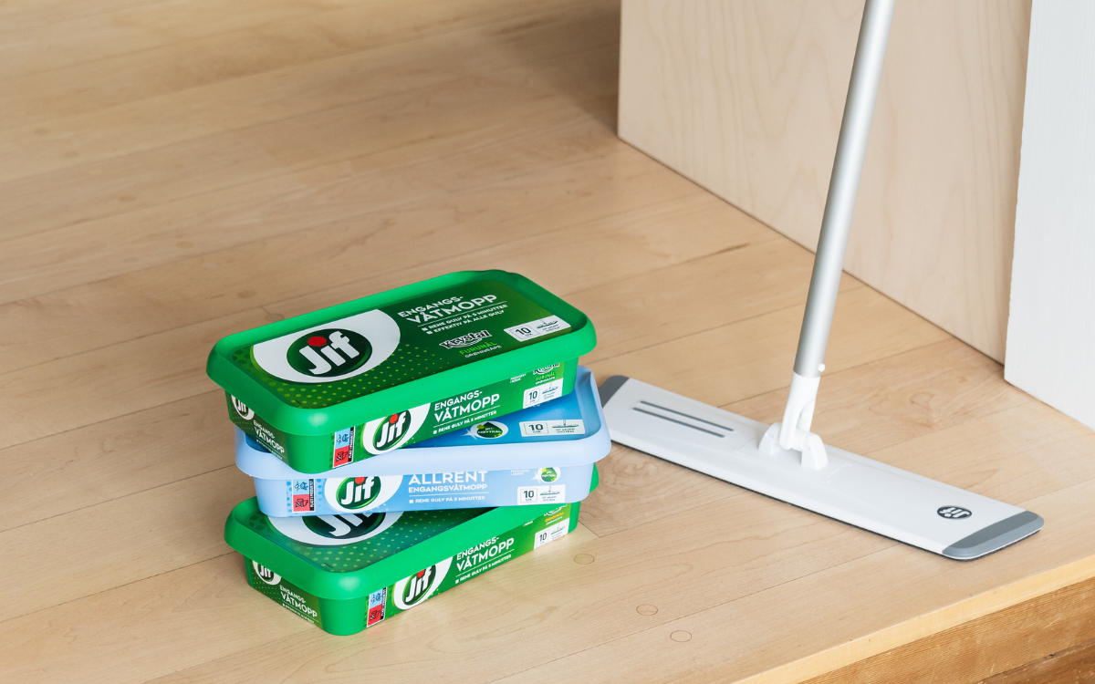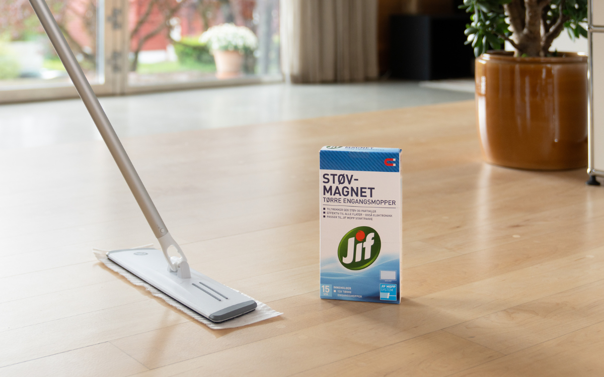 Det sier seg selv hvorfor gulvet bør vaskes sist: Når alle andre flater har blitt vasket, har det sikkert kommet både støv og smuss på gulvet, og gulvrengjøringen blir prikken over i’en i husvasken. Til tregulv som parkett, ubehandlet tre, malte- og lakkerte treflater passer Jif Krystal Engangsvåtmopp perfekt. Jif Allrent Engangsvåtmopp kan brukes på de fleste andre gulvflater.