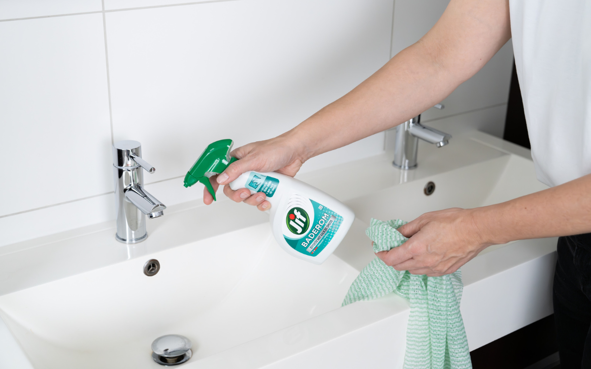 Badet bør de voksne ta seg av, da det ofte er litt tøffere flekker her enn ellers i huset. Det trenger ikke å ta mer enn en times tid å vaske hele badet. Start med å helle Jif Avløpsåpner i sluk for å unngå tette rør. Gå videre til toalett, fliser og deretter dusj eller badekar. Her kan du bruke baderomsspray for å løse opp kalk som har samlet seg opp. Også rundt vasken kan du bruke baderomssprayen, eller Jif Wipe Toalett og Bad.