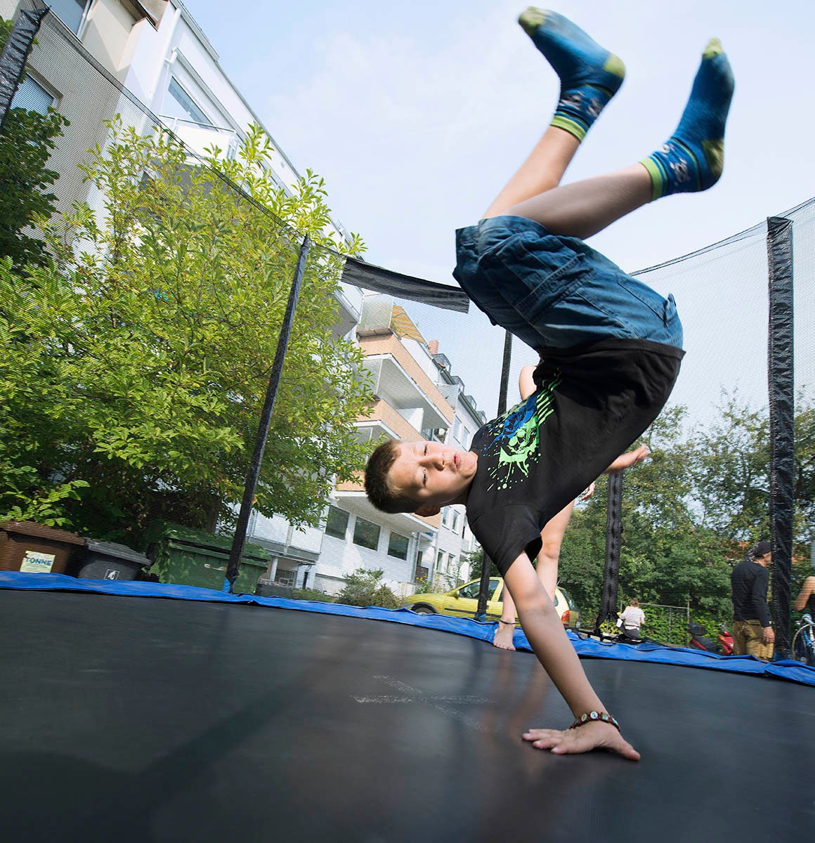 Det som er viktig å passer på, er at trampolinen står støtt på et jevnt underlag. Det er i tillegg påbudt med sikkerhetsnett på store og mellomstore trampoliner.