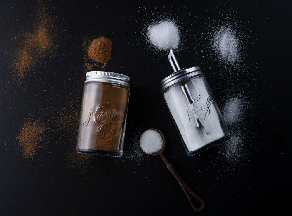 Sukker og kanel sett med den klassiske Norgeslogoen i glass.