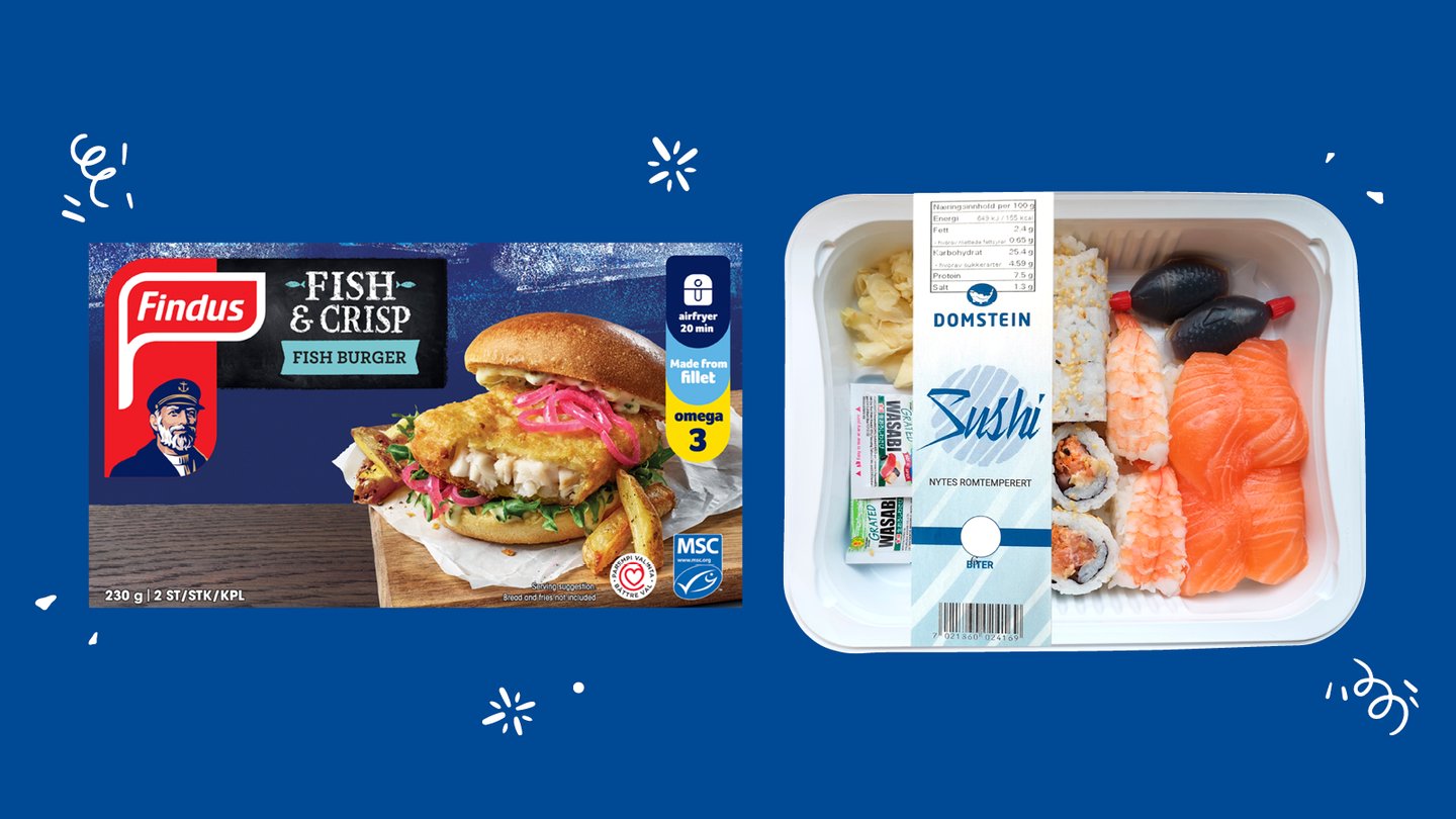 Har du små (eller store) fiske-skeptikere i hus, bør du teste om Findus Fish & Crisp-burgere slår an. Alle sushi-elskere kan glede seg over at vi sammen med produsent Domstein har sørget for at du nå får pakker med 16 smakfulle sushi-biter i alle varehusene våre!