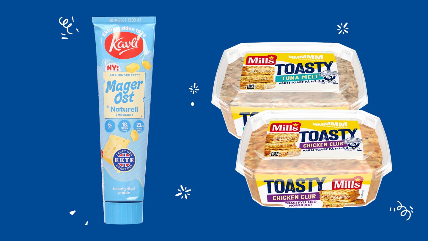 Til brødskiva finner du Kavli Magerost Naturell, laget med ekte ost og perfekt for deg som ønsker et proteinrikt pålegg med færre kalorier. Mills lanserer også to nye majonesbaserte salater: Toasty Chicken Club og Toasty Tuna Melt – perfekt når du vil kose deg litt ekstra. Prøv dem som toastfyll og lag digg toast på 1-2-3!