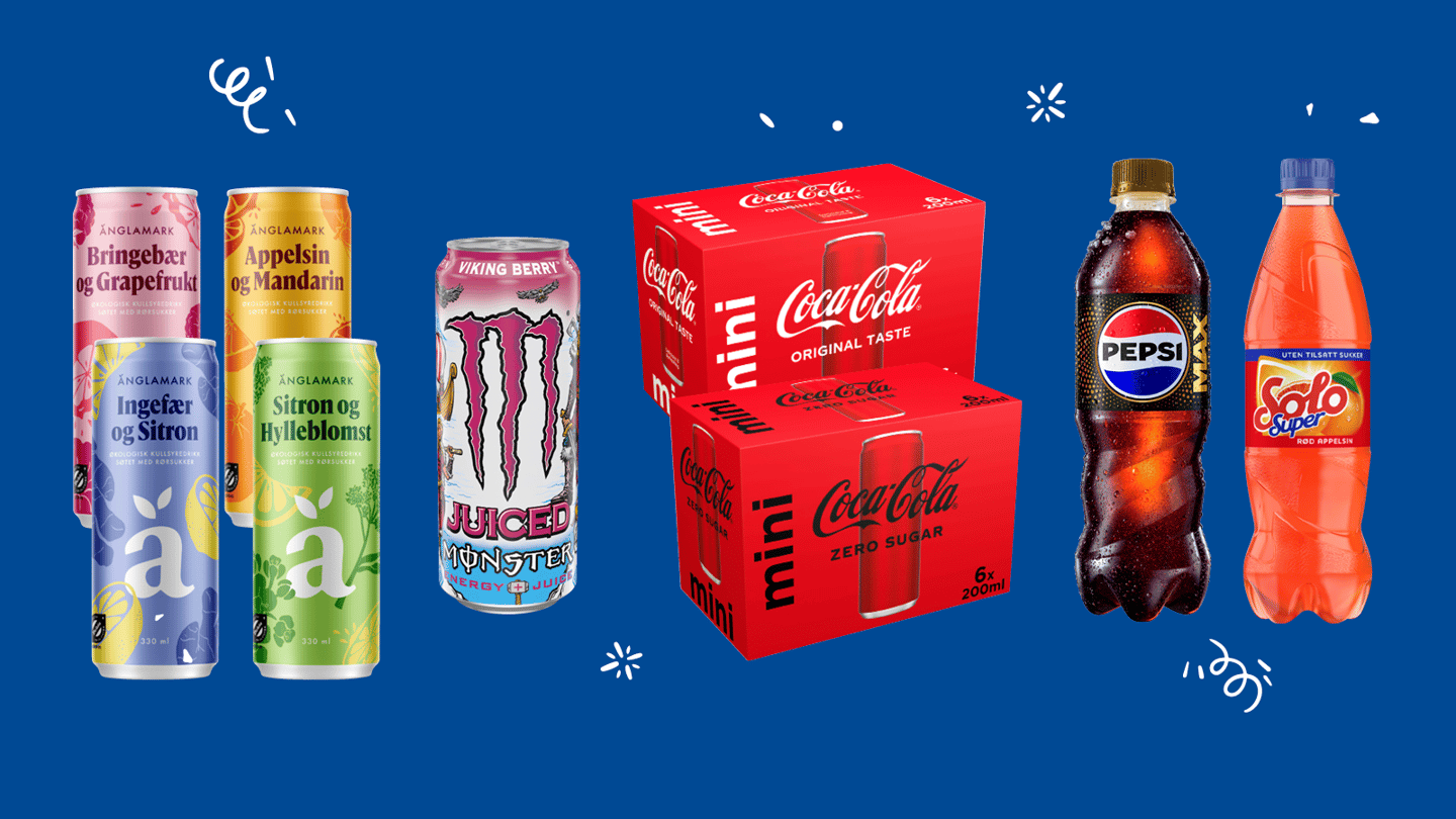 Monster Energys nye Viking Berry er inspirert av ville nordiske bær og skandinavisk frukt. Denne kraftige energidrikken blander ekte fruktjuicer med eksotiske smaker for en helt ny smaksopplevelse. Coca-Cola lanserer ny 6-pakning med 200 ml-bokser, både med og uten sukker. Solo Super kommer med en splitter ny smak: rød appelsin, og Pepsi Max lanserer nå en koffeinfri variant.