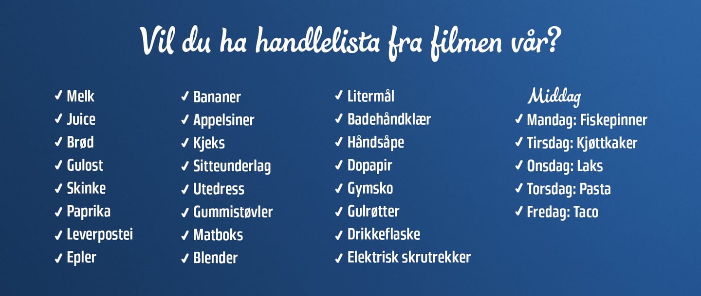 Med litt planlegging trenger du nemlig bare én tur til Obs, for å få tak i alt du trenger av mat og nødvendig utstyr. På den måten blir det enklere å sjonglere en hverdag med barnehage, skole, jobb og fritidsaktiviteter på planen.