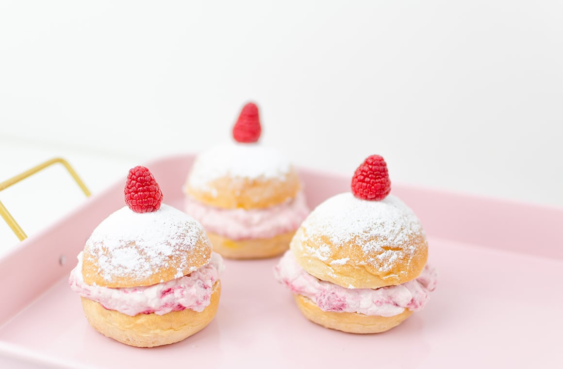 Bland kremen med rørte bringebær så blir den rosa og lekker, og ikke minst veldig god. Strø over melis og pynt gjerne med et bringebær på toppen av fastelavnsbollene.