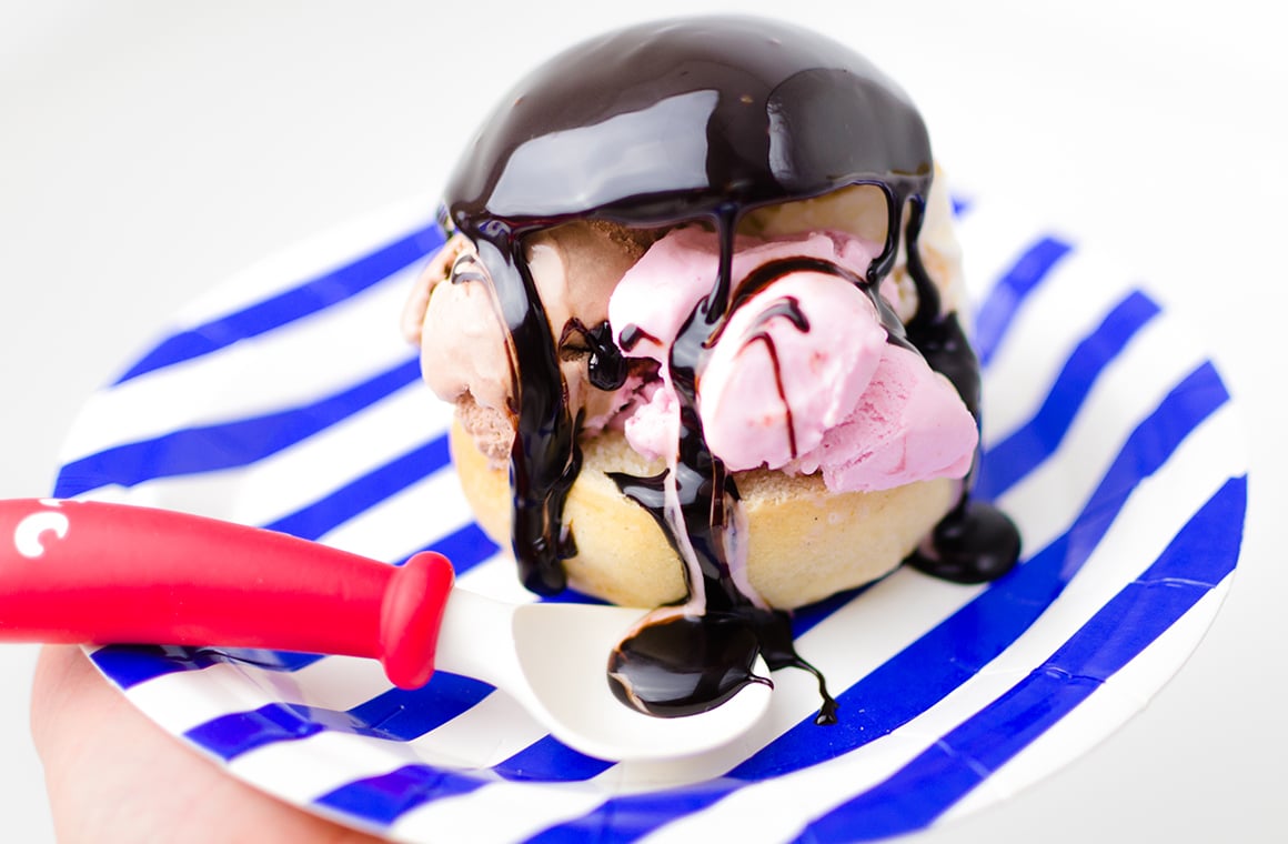 Det er jo bare kreativiteten som setter grenser, så hvorfor ikke fylle fastelavnsbollene med is? Hell over deilig sjokoladesaus før servering. Spises helst med skje! 🥄