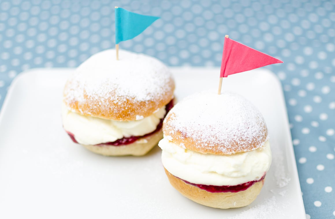 De klassiske fastelavnsbollene slik vi er vant til å se dem, med deilig krem og syltetøy. Ikke noe i veien for å gjøre tradisjonelt.