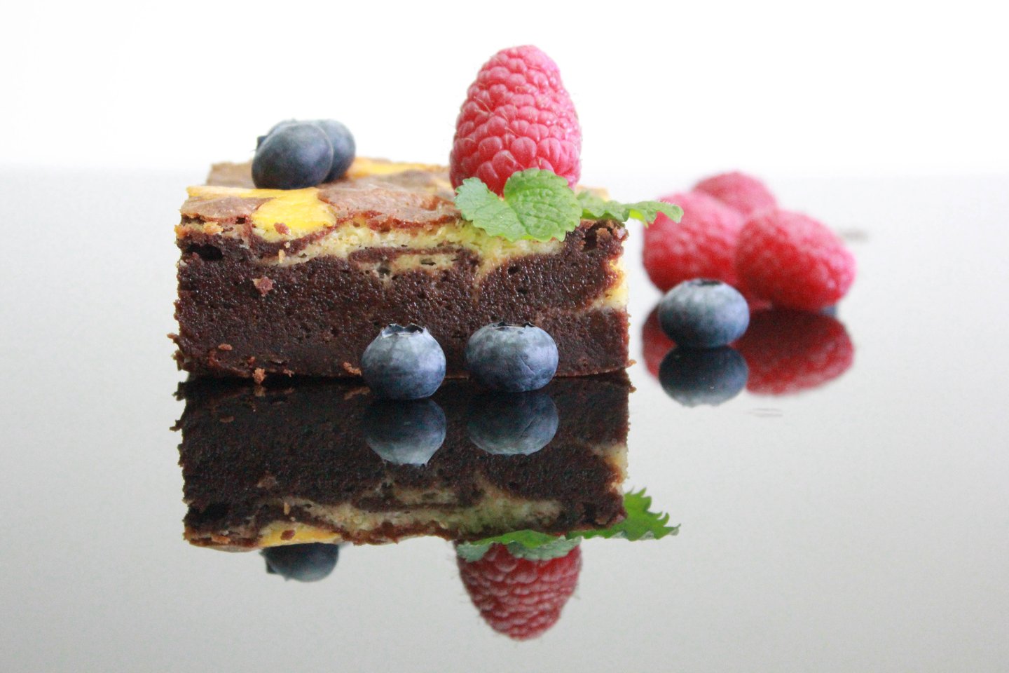 Lag små «hull» i røren ved å dra den litt til siden med en skje, for deretter å helle litt ostemasse oppi med en annen skje.