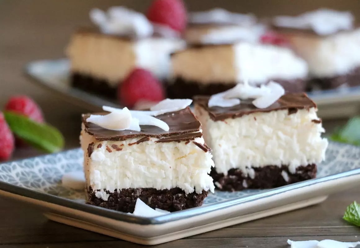 3. Fordel bountyfyllet over den avkjølte kakebunnen. Topp med sukkerfri, smeltet sjokolade. La kaka stå kjølig i minst 30 minutter før servering. Oppbevares i kjøleskap, den holder seg fint i minst 3-4 dager.