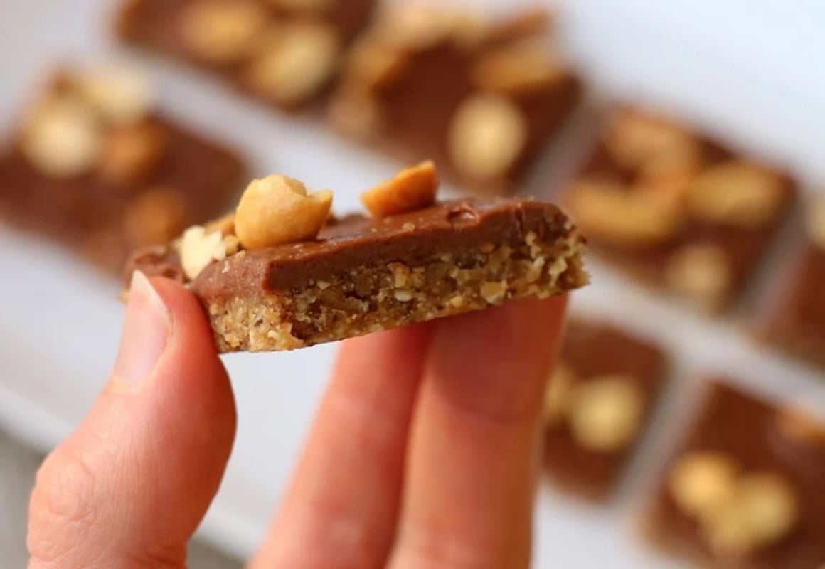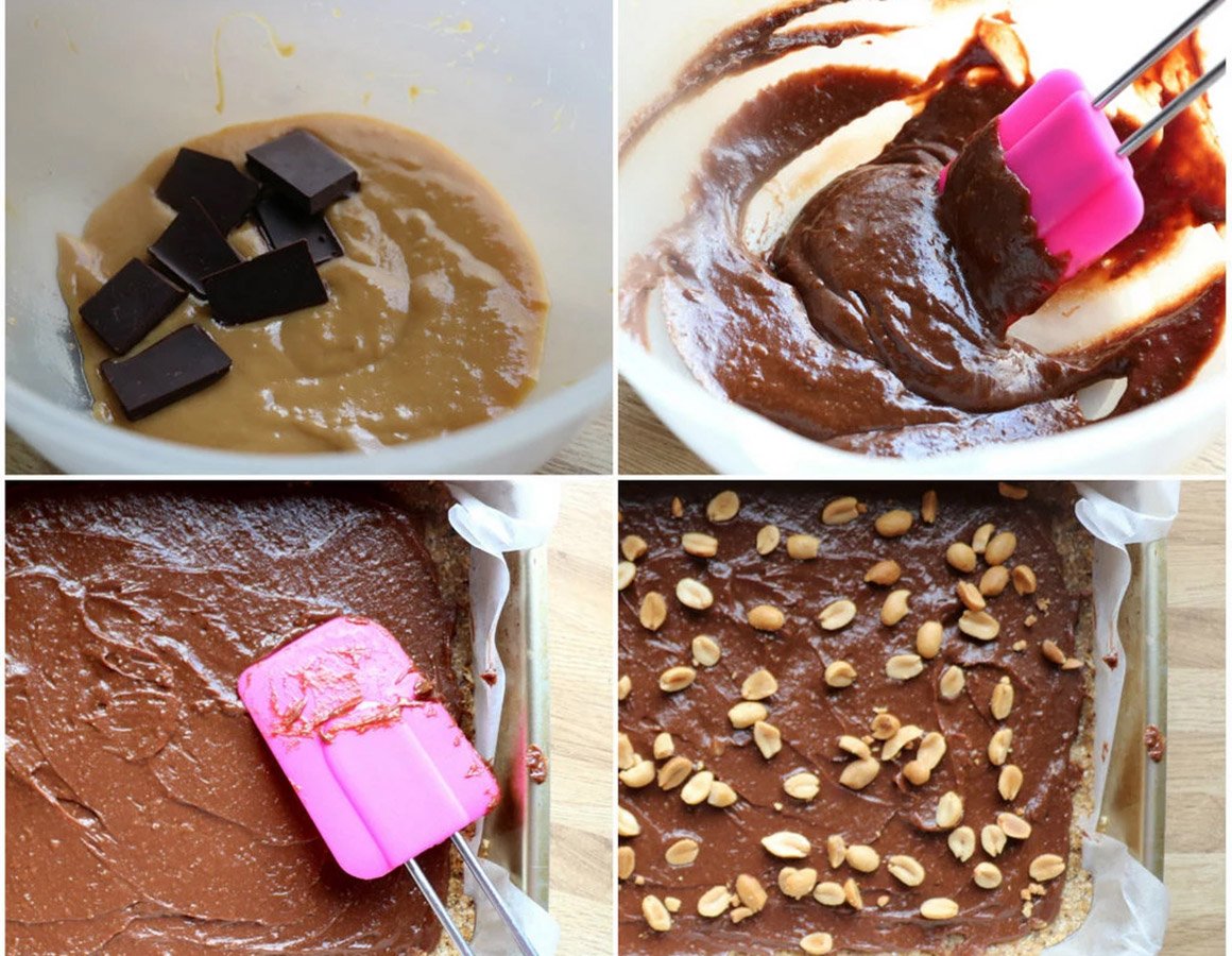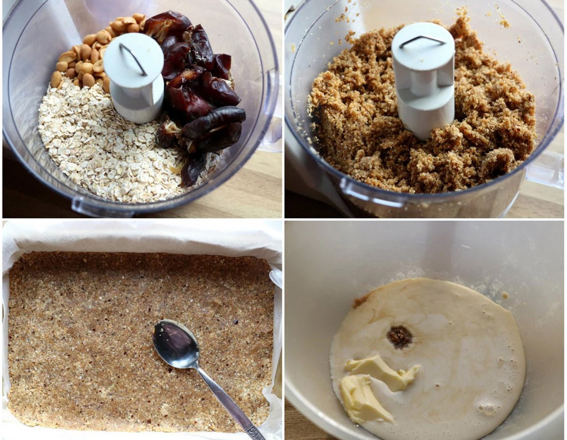 1. Start med bunnen: Kjør peanøtter, havregryn, sukrin gold og dadler (husk å ta ut steinen) i en foodprosessor eller kraftig blender. Kjør på full guffe i 1-2 minutter, til en jevn, smuldrete og fuktig masse.