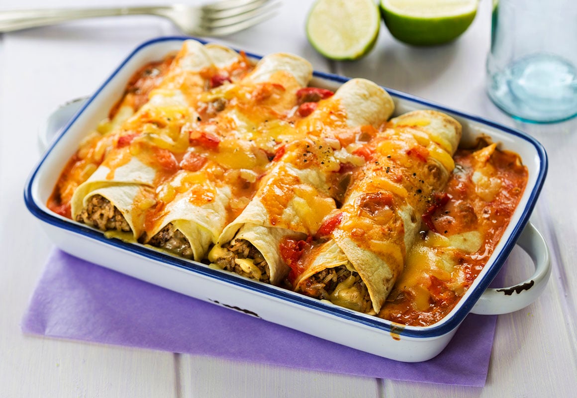 1. Fyll hver tortillalefse med kjøttdeigblandingen. Rull dem sammen og legg dem ved siden av hverandre i en ildfast form.