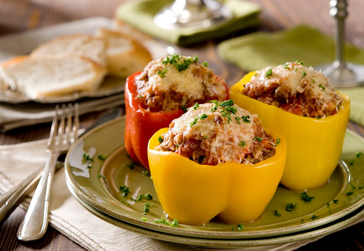 2. Fyll hver paprika med kjøttdeigblandingen, og strø litt ost på toppen. Sett dem i en ildfast form og stek dem i ovnen på 200 ˚C i 5-10 minutter. Serveres sammen med en god salat eller pasta.