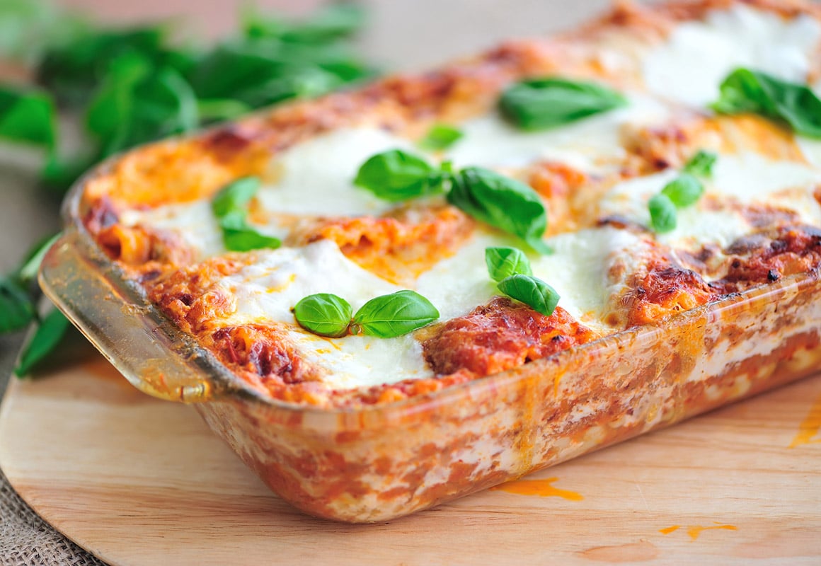 3. Strø ost på toppen og stek lasagnen midt i ovnen på 200 ˚C i 30-40 minutter. La den hvile litt før du serverer den.