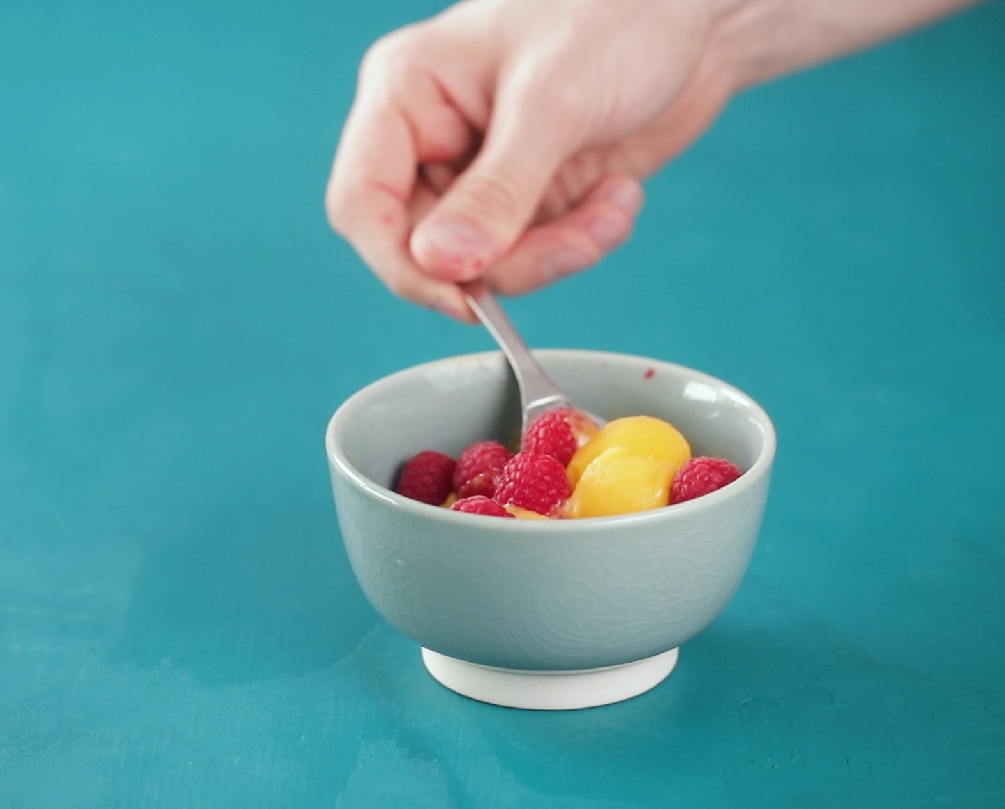 Hell til slutt blandingen over i en egnet form, og server med friske bringebær. Om du har litt til overs, eller ikke skal servere sorbeten med en gang, holder den seg fint i fryseren.