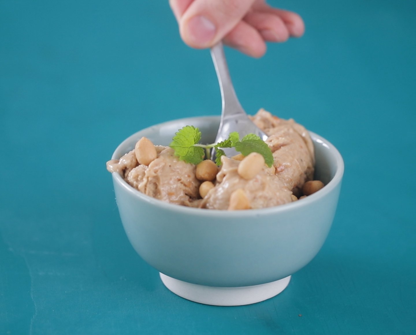 Det skal nemlig ikke mer enn noen sekunder i blenderen for å gjøre fryst banan til søt og god bananis. Kjør bananene i blenderen til røren får en tykk og kremet konsistens. Hva du putter oppi for ekstra smak er opp til deg – her er det mulig å være kreativ! I vår is puttet vi oppi peanøttsmør og honning. Den søte bananen og det salte peanøttsmøret er nemlig som skapt for hverandre.