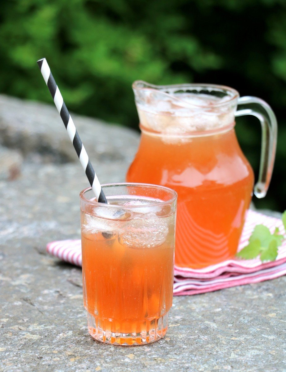 Vann, sukker og sitron kan justeres etter smak. Serveres med isbiter, mynteblader, sitronskiver og limeskiver.