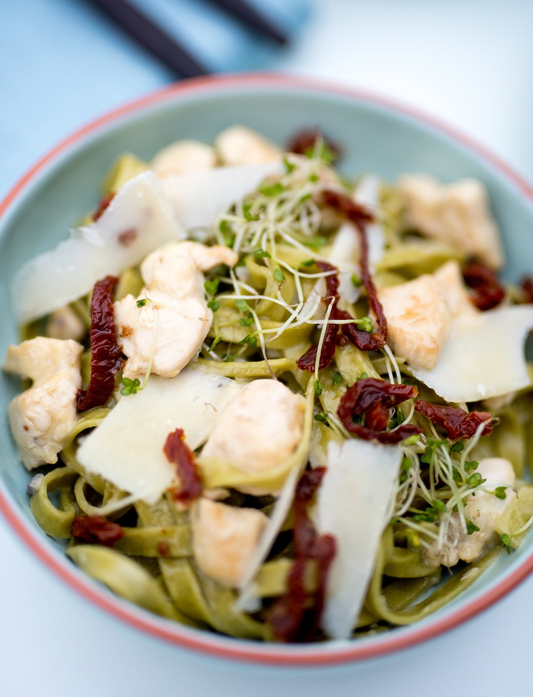 Kok pastaen etter anvisning på pakken. Koketid er 1 minutt. Når pastaen er ferdig kokt, sil av vannet og bland pastaen med den kremede kyllingen.