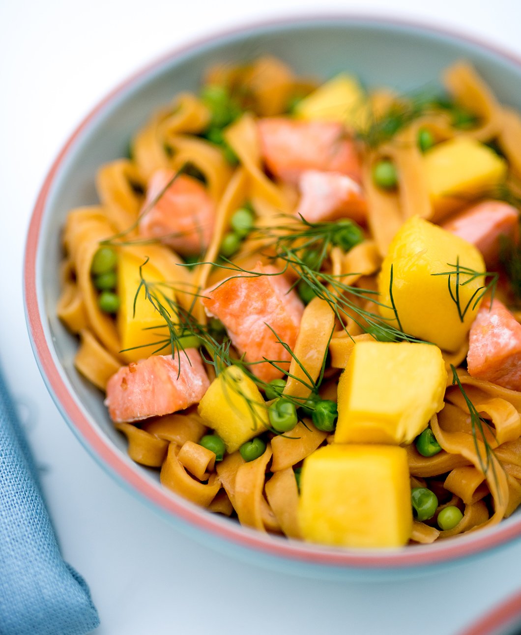 Kok pastaen etter anvisning på pakken. Koketid er 1 minutt. Når pastaen er ferdig kokt, sil av vannet og legg pastaen på et serveringsfat. Sirkle over litt olje. Bland erter med pastaen. Legg over laksen og mangoen. Evt. pynt med dill. Smak til med salt og pepper.